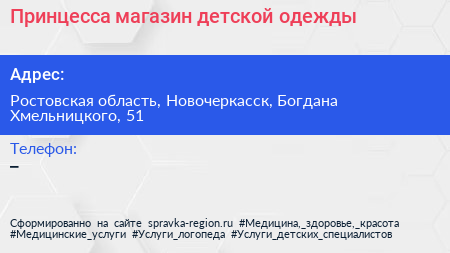 Принцесса, магазин детской одежды по адресу Ростовская область, Новочеркасск, Богдана Хмельницкого, 51 в дальнейшем Организация, размещена в следующих категориях:
