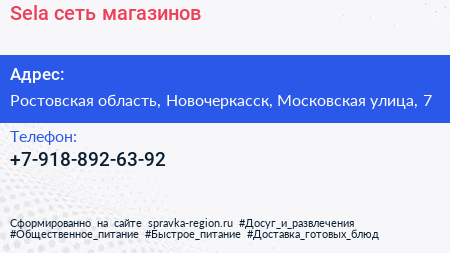Sela, сеть магазинов по адресу Ростовская область, Новочеркасск, Московская улица, 7 в дальнейшем Организация, размещена в следующих категориях: