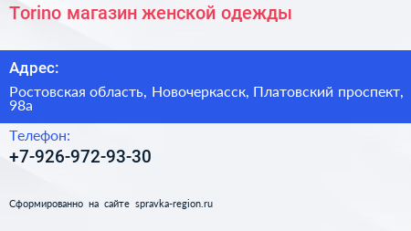 Torino, магазин женской одежды по адресу Ростовская область, Новочеркасск, Платовский проспект, 98а в дальнейшем Организация, размещена в следующих категориях: