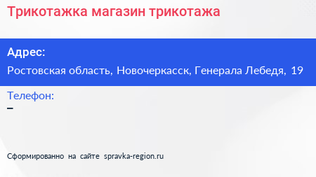 Трикотажка, магазин трикотажа по адресу Ростовская область, Новочеркасск, Генерала Лебедя, 19 в дальнейшем Организация, размещена в следующих категориях: