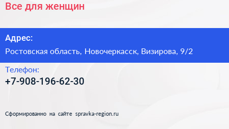 Все для женщин по адресу Ростовская область, Новочеркасск, Визирова, 9/2 в дальнейшем Организация, размещена в следующих категориях: