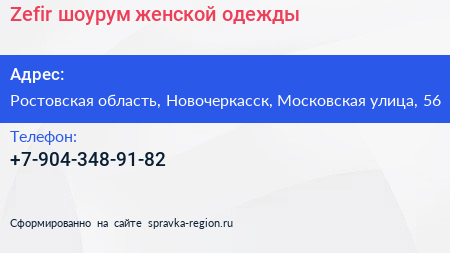 Zefir, шоурум женской одежды по адресу Ростовская область, Новочеркасск, Московская улица, 56 в дальнейшем Организация, размещена в следующих категориях: