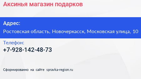 Аксинья, магазин подарков по адресу Ростовская область, Новочеркасск, Московская улица, 10 в дальнейшем Организация, размещена в следующих категориях:
