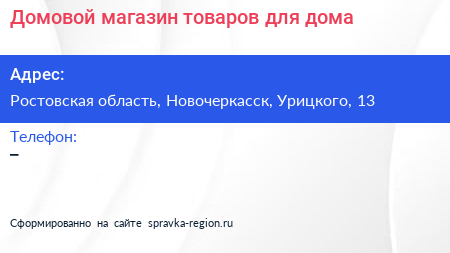 Домовой, магазин товаров для дома по адресу Ростовская область, Новочеркасск, Урицкого, 13 в дальнейшем Организация, размещена в следующих категориях: