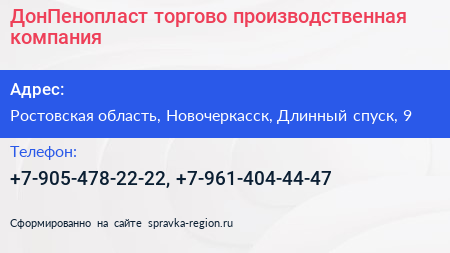 ДонПенопласт, торгово-производственная компания по адресу Ростовская область, Новочеркасск, Длинный спуск, 9 в дальнейшем Организация, размещена в следующих категориях:
