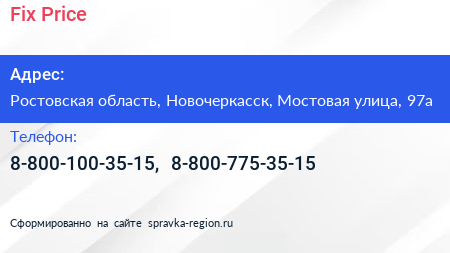 Fix Price по адресу Ростовская область, Новочеркасск, Мостовая улица, 97а в дальнейшем Организация, размещена в следующих категориях: