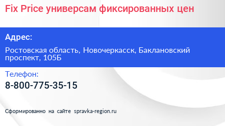 Fix Price, универсам фиксированных цен по адресу Ростовская область, Новочеркасск, Баклановский проспект, 105Б в дальнейшем Организация, размещена в следующих категориях: