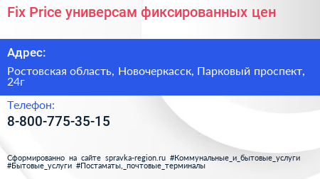 Fix Price, универсам фиксированных цен по адресу Ростовская область, Новочеркасск, Парковый проспект, 24г в дальнейшем Организация, размещена в следующих категориях: