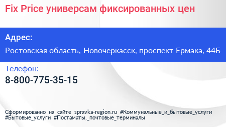 Fix Price, универсам фиксированных цен по адресу Ростовская область, Новочеркасск, проспект Ермака, 44Б в дальнейшем Организация, размещена в следующих категориях: