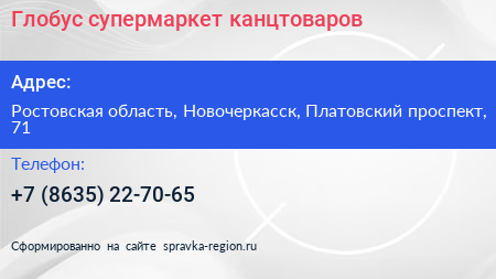 Глобус, супермаркет канцтоваров по адресу Ростовская область, Новочеркасск, Платовский проспект, 71 в дальнейшем Организация, размещена в следующих категориях: