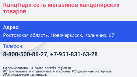 КанцПарк, сеть магазинов канцелярских товаров по адресу Ростовская область, Новочеркасск, Калинина, 67 в дальнейшем Организация, размещена в следующих категориях: