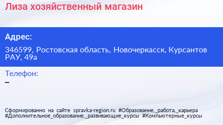 Лиза, хозяйственный магазин по адресу 346599, Ростовская область, Новочеркасск, Курсантов РАУ, 49а в дальнейшем Организация, размещена в следующих категориях:
