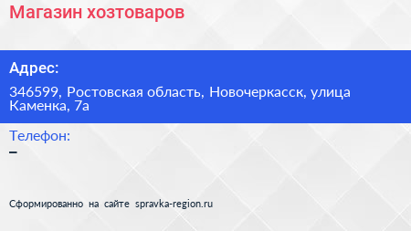 Магазин хозтоваров по адресу 346599, Ростовская область, Новочеркасск, улица Каменка, 7а в дальнейшем Организация, размещена в следующих категориях:
