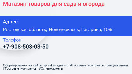 Магазин товаров для сада и огорода по адресу Ростовская область, Новочеркасск, Гагарина, 108г в дальнейшем Организация, размещена в следующих категориях: