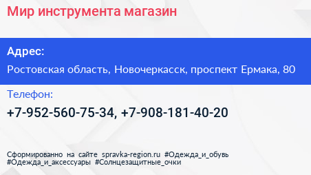 Мир инструмента, магазин по адресу Ростовская область, Новочеркасск, проспект Ермака, 80 в дальнейшем Организация, размещена в следующих категориях: