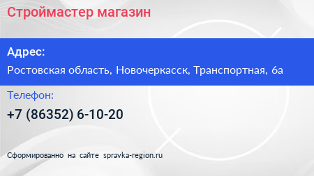 Строймастер, магазин по адресу Ростовская область, Новочеркасск, Транспортная, 6а в дальнейшем Организация, размещена в следующих категориях: