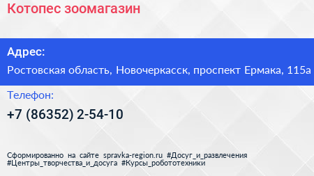 Котопес, зоомагазин по адресу Ростовская область, Новочеркасск, проспект Ермака, 115а в дальнейшем Организация, размещена в следующих категориях: