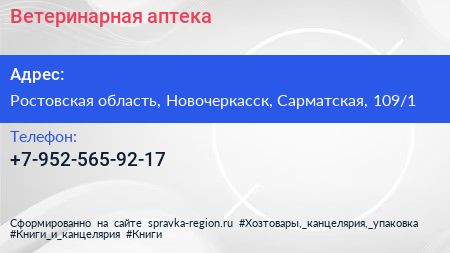 Ветеринарная аптека по адресу Ростовская область, Новочеркасск, Сарматская, 109/1 в дальнейшем Организация, размещена в следующих категориях: