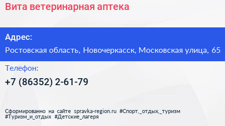 Вита, ветеринарная аптека по адресу Ростовская область, Новочеркасск, Московская улица, 65 в дальнейшем Организация, размещена в следующих категориях: