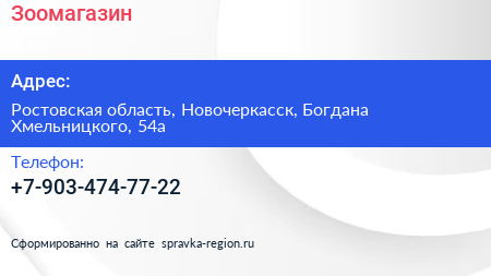 Зоомагазин по адресу Ростовская область, Новочеркасск, Богдана Хмельницкого, 54а в дальнейшем Организация, размещена в следующих категориях: