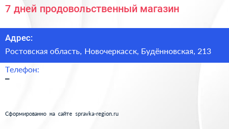 7 дней, продовольственный магазин по адресу Ростовская область, Новочеркасск, Будённовская, 213 в дальнейшем Организация, размещена в следующих категориях: