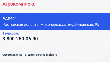 Агрокомплекс по адресу Ростовская область, Новочеркасск, Будённовская, 95 в дальнейшем Организация, размещена в следующих категориях: