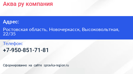 Аква.ру, компания по адресу Ростовская область, Новочеркасск, Высоковольтная, 22/35 в дальнейшем Организация, размещена в следующих категориях: