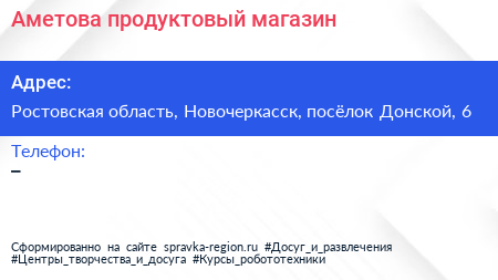 Аметова, продуктовый магазин по адресу Ростовская область, Новочеркасск, посёлок Донской, 6 в дальнейшем Организация, размещена в следующих категориях: