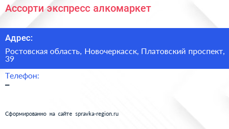 Ассорти-экспресс, алкомаркет по адресу Ростовская область, Новочеркасск, Платовский проспект, 39 в дальнейшем Организация, размещена в следующих категориях: