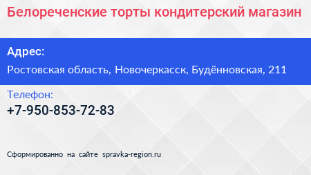 Белореченские торты, кондитерский магазин по адресу Ростовская область, Новочеркасск, Будённовская, 211 в дальнейшем Организация, размещена в следующих категориях: