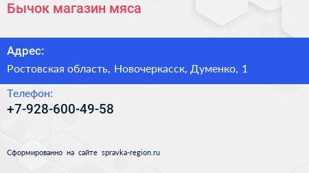 Бычок, магазин мяса по адресу Ростовская область, Новочеркасск, Думенко, 1 в дальнейшем Организация, размещена в следующих категориях: