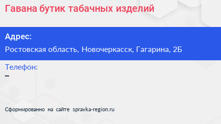 Гавана, бутик табачных изделий по адресу Ростовская область, Новочеркасск, Гагарина, 2Б в дальнейшем Организация, размещена в следующих категориях: