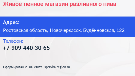 Живое пенное, магазин разливного пива по адресу Ростовская область, Новочеркасск, Будённовская, 122 в дальнейшем Организация, размещена в следующих категориях: