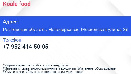 Koala food по адресу Ростовская область, Новочеркасск, Московская улица, 36 в дальнейшем Организация, размещена в следующих категориях: