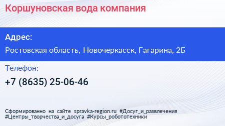 Коршуновская вода, компания по адресу Ростовская область, Новочеркасск, Гагарина, 2Б в дальнейшем Организация, размещена в следующих категориях: