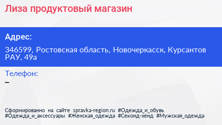 Лиза, продуктовый магазин по адресу 346599, Ростовская область, Новочеркасск, Курсантов РАУ, 49а в дальнейшем Организация, размещена в следующих категориях:
