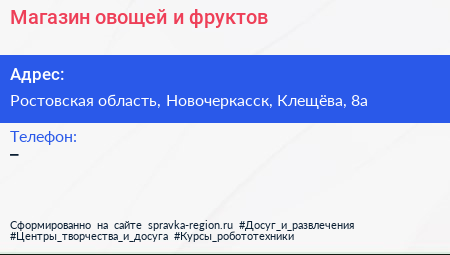 Магазин овощей и фруктов по адресу Ростовская область, Новочеркасск, Клещёва, 8а в дальнейшем Организация, размещена в следующих категориях: