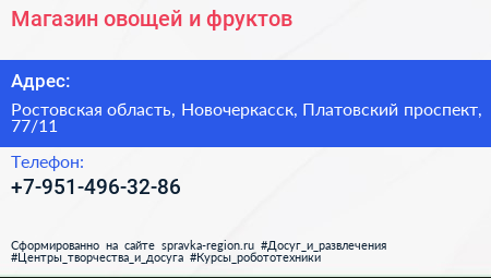 Магазин овощей и фруктов по адресу Ростовская область, Новочеркасск, Платовский проспект, 77/11 в дальнейшем Организация, размещена в следующих категориях: