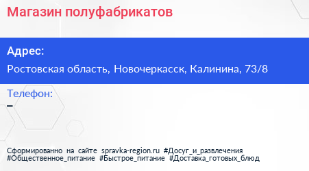 Магазин полуфабрикатов по адресу Ростовская область, Новочеркасск, Калинина, 73/8 в дальнейшем Организация, размещена в следующих категориях: