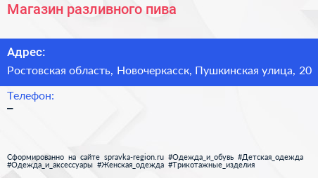 Магазин разливного пива по адресу Ростовская область, Новочеркасск, Пушкинская улица, 20 в дальнейшем Организация, размещена в следующих категориях:
