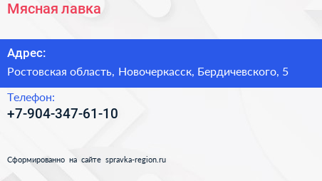 Мясная лавка по адресу Ростовская область, Новочеркасск, Бердичевского, 5 в дальнейшем Организация, размещена в следующих категориях: