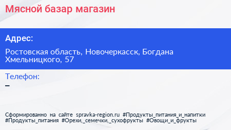 Мясной базар, магазин по адресу Ростовская область, Новочеркасск, Богдана Хмельницкого, 57 в дальнейшем Организация, размещена в следующих категориях: