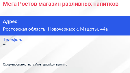 Мега-Ростов, магазин разливных напитков по адресу Ростовская область, Новочеркасск, Мацоты, 44а в дальнейшем Организация, размещена в следующих категориях: