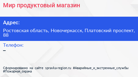 Мир, продуктовый магазин по адресу Ростовская область, Новочеркасск, Платовский проспект, 88 в дальнейшем Организация, размещена в следующих категориях: