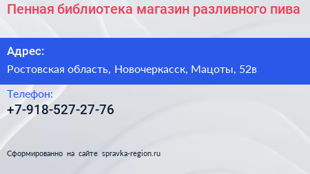 Пенная библиотека, магазин разливного пива по адресу Ростовская область, Новочеркасск, Мацоты, 52в в дальнейшем Организация, размещена в следующих категориях: