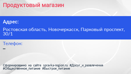 Продуктовый магазин по адресу Ростовская область, Новочеркасск, Парковый проспект, 30/1 в дальнейшем Организация, размещена в следующих категориях: