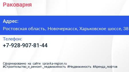 Раковарня по адресу Ростовская область, Новочеркасск, Харьковское шоссе, 38 в дальнейшем Организация, размещена в следующих категориях: