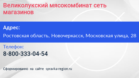 Великолукский мясокомбинат, сеть магазинов по адресу Ростовская область, Новочеркасск, Московская улица, 28 в дальнейшем Организация, размещена в следующих категориях: