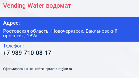 Vending Water, водомат по адресу Ростовская область, Новочеркасск, Баклановский проспект, 192а в дальнейшем Организация, размещена в следующих категориях: