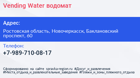 Vending Water, водомат по адресу Ростовская область, Новочеркасск, Баклановский проспект, 60 в дальнейшем Организация, размещена в следующих категориях: